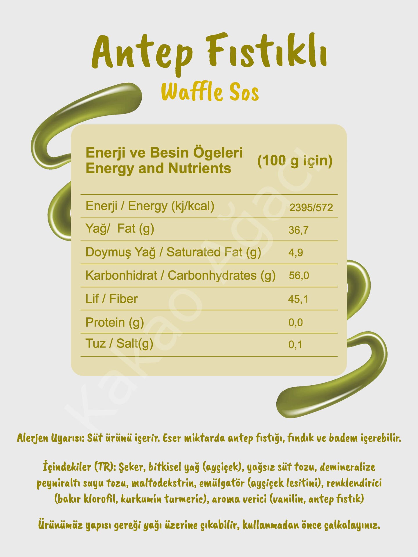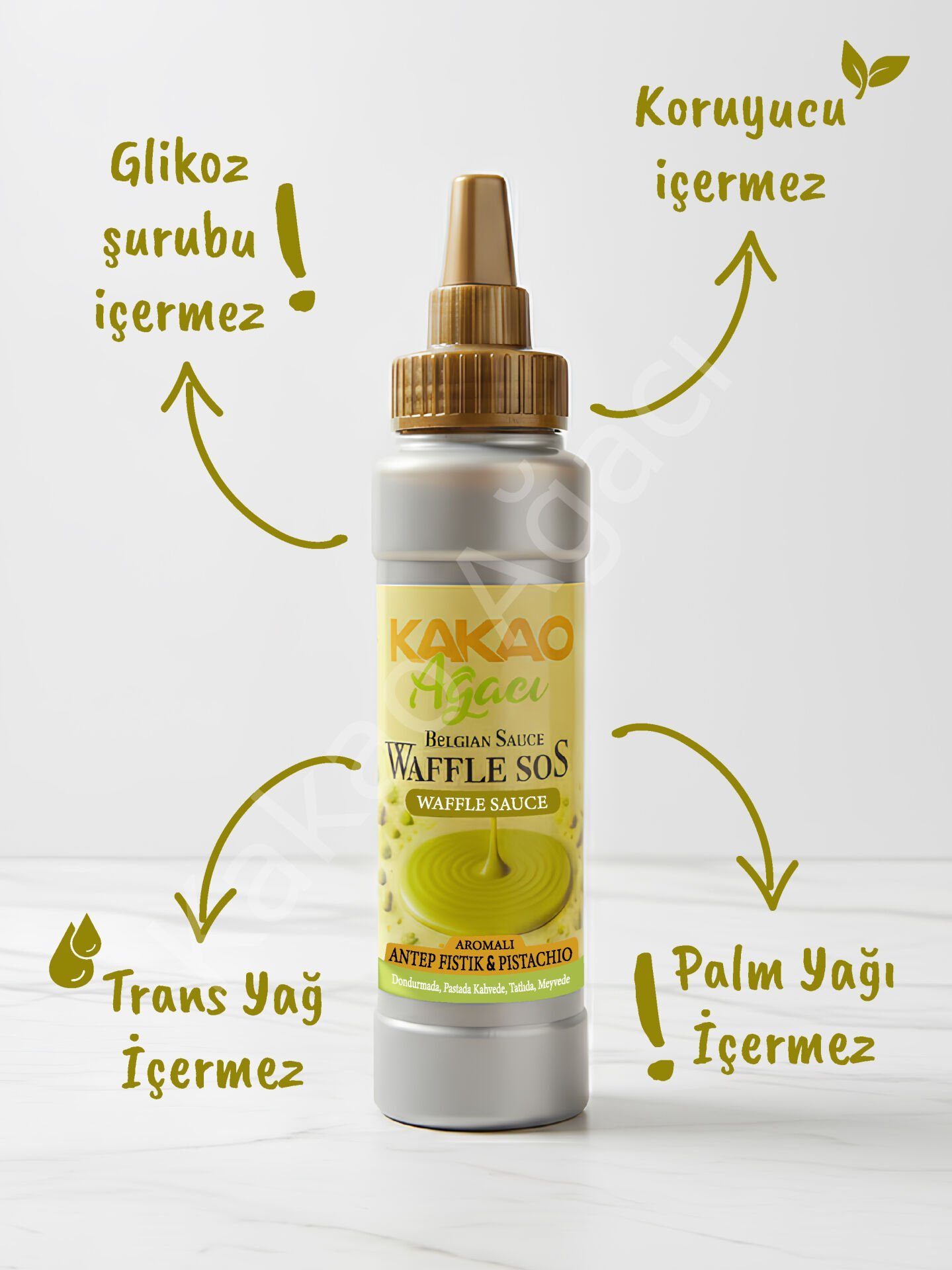 - Belçika waffle sos kalitesiyle üretilmiştir.; - Antep Fıstık sos wafflelar, krepler ve pankekler için özel olarak tasarlanmış lezzetli bir sos.; - Tatlılarınızda ve dondurmalarınızda kullanabileceğiniz, farklı lezzet katmanları sunan bir ürün.; - 300 gramlık ambalajı ile uzun süreli kullanım imkanı sağlar.;