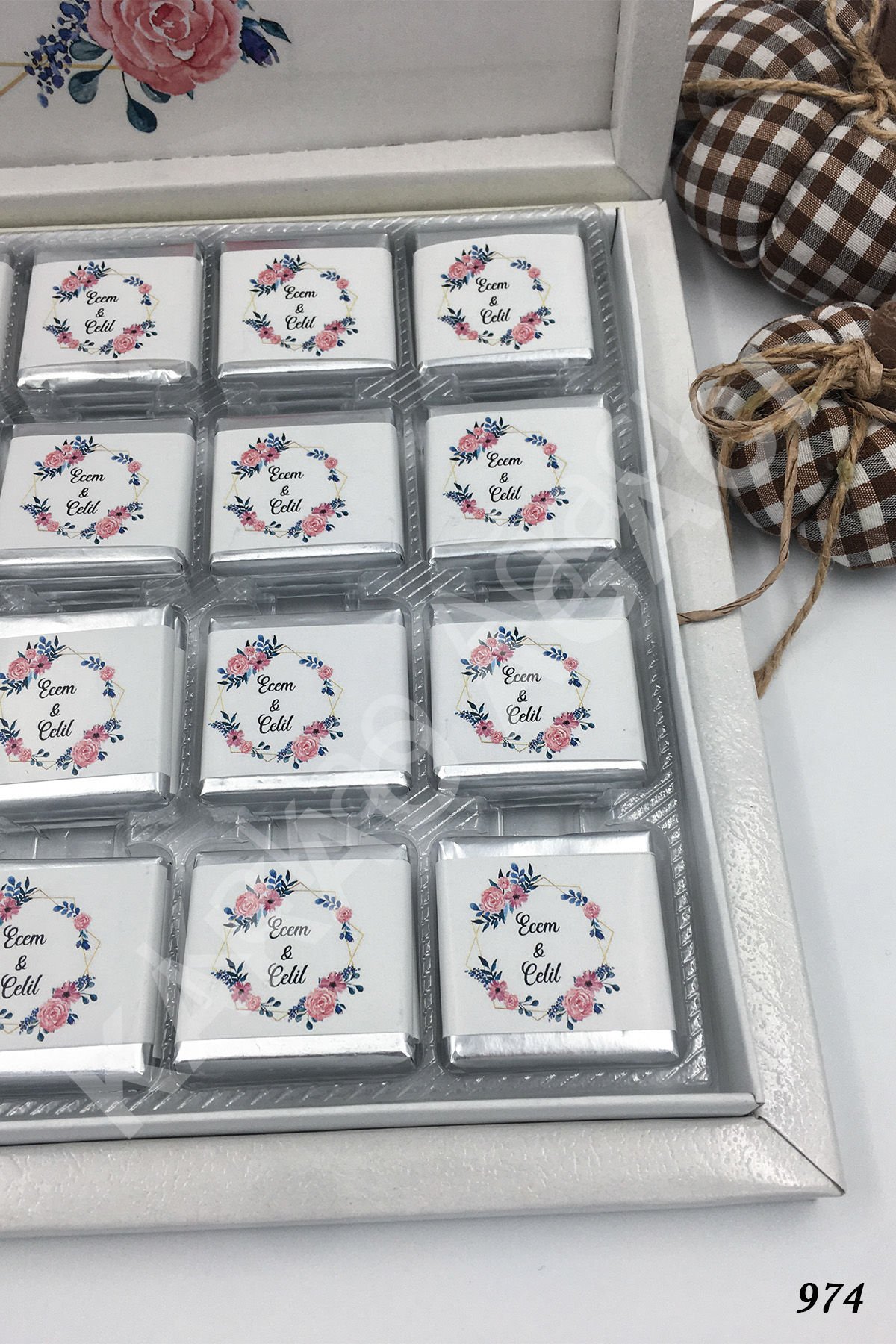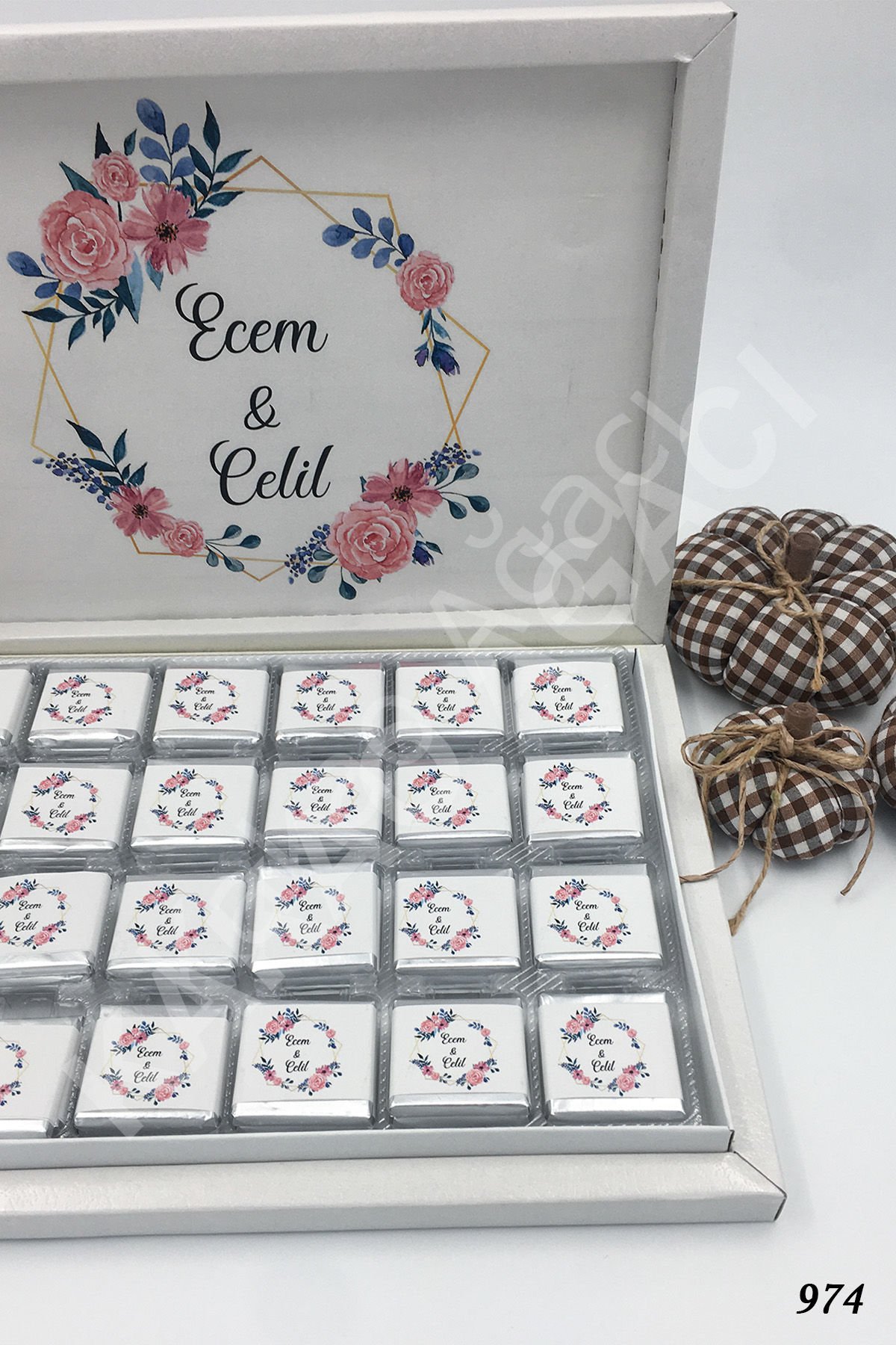 Çiçekli Gelin & Damat Karton Kutu İsme Özel Çikolata KA974