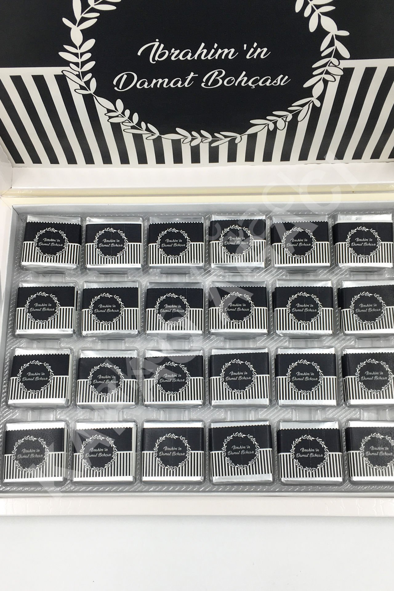 Erkek Siyah Beyaz Çizgili Bohça Karton Kutu İsme Özel Çikolata KA96