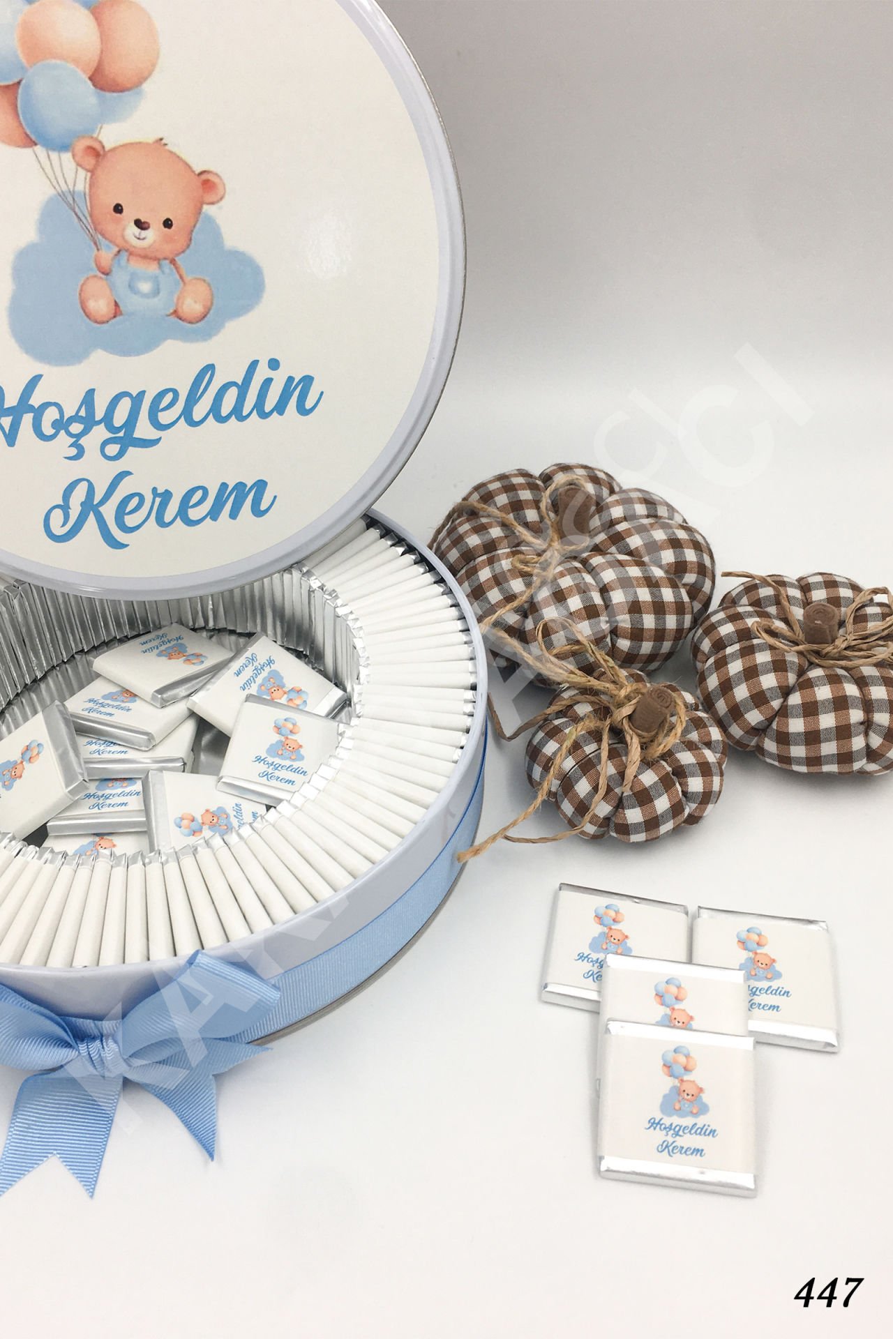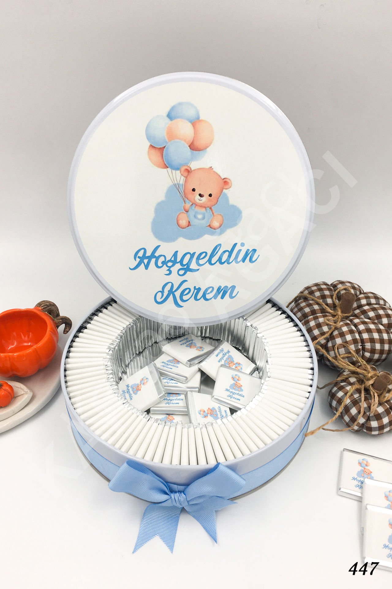 Mavi Ayıcık Balonlu Metal Kutu İsme Özel Çikolata KA447