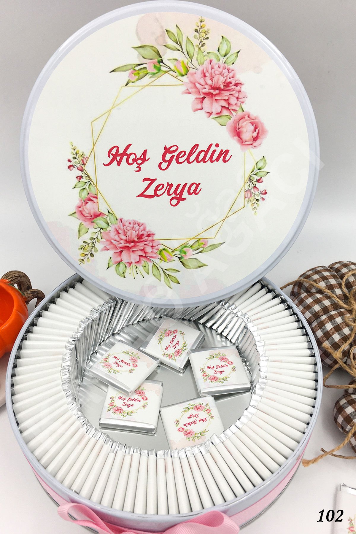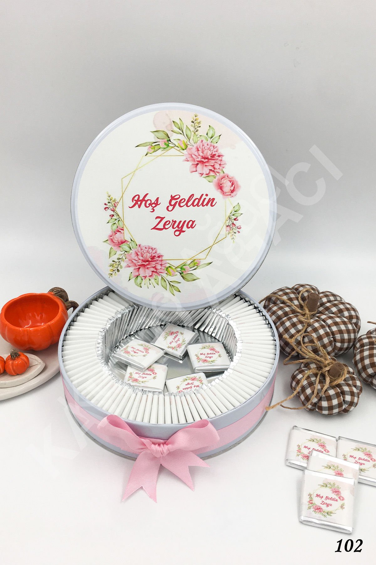 Pembe Çiçek Çerçeveli Metal Kutu İsme Özel Çikolata KA102