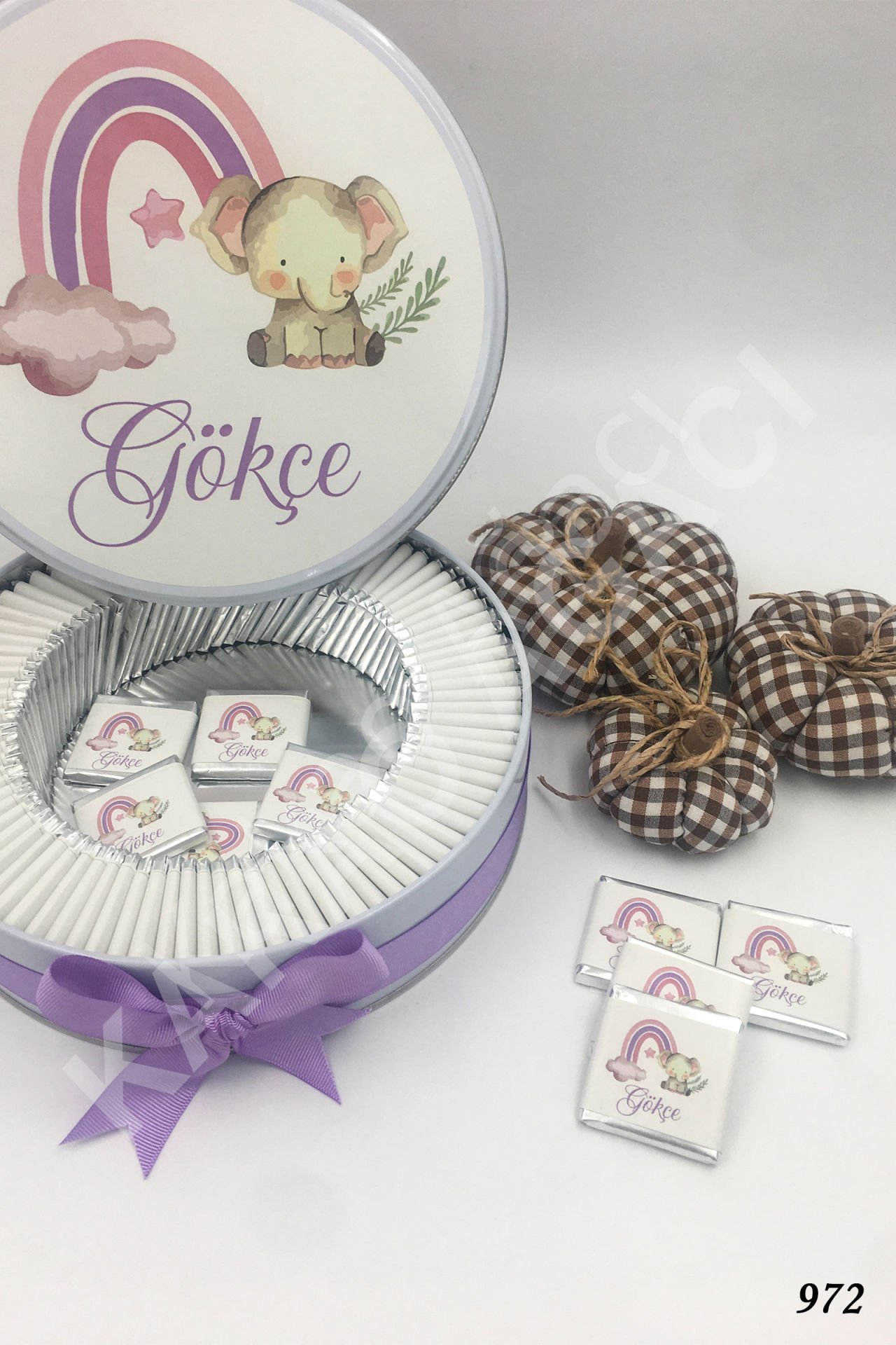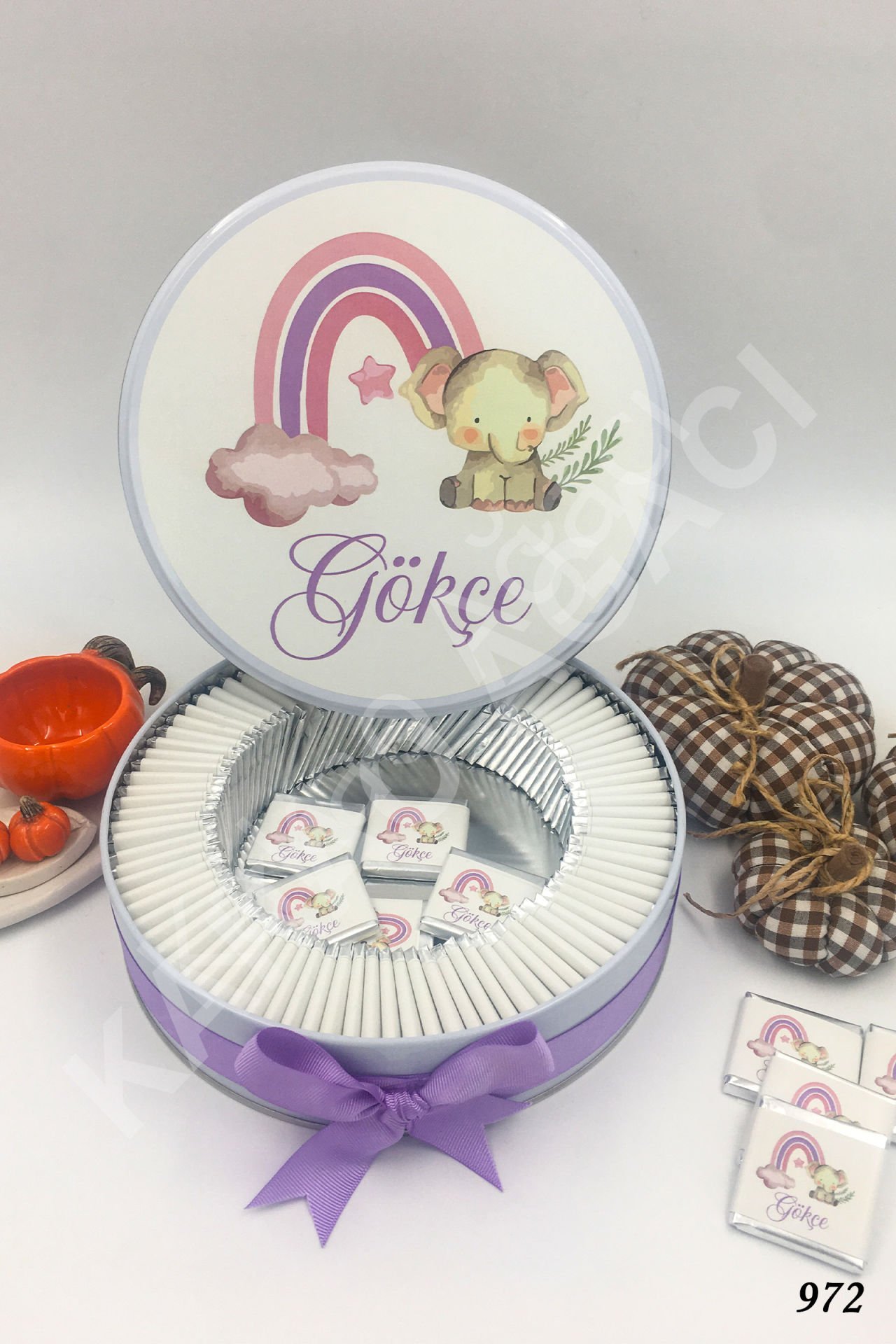 Pembe Gökkuşağı ve Fil Metal Kutu İsme Özel Çikolata KA972