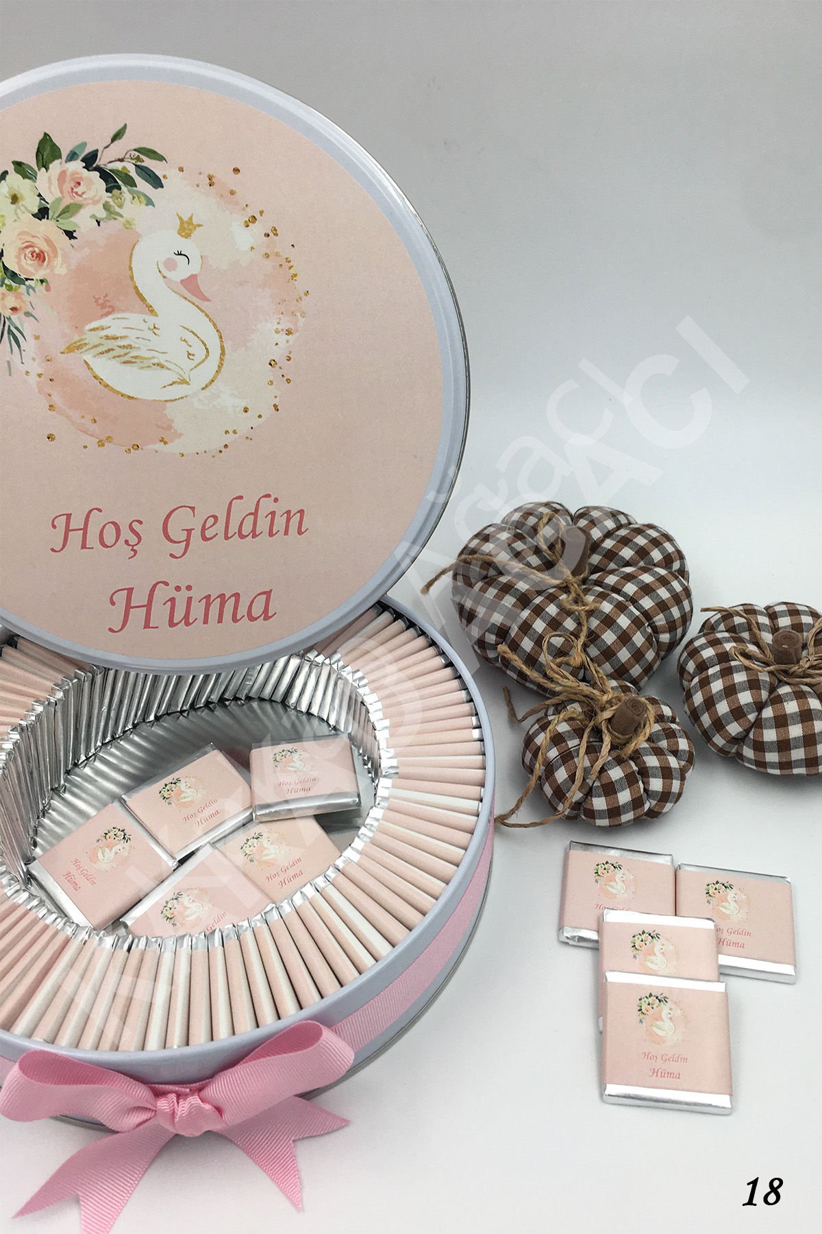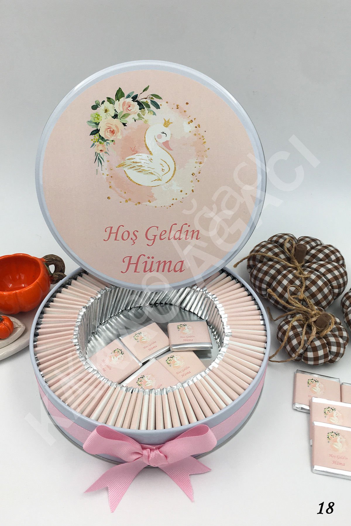 Pembe Kuğu Metal Kutu İsme Özel Çikolata KA18