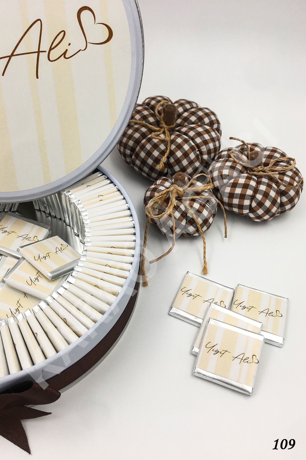 Sarı Çizgili Kalpli Metal Kutu İsme Özel Çikolata KA109